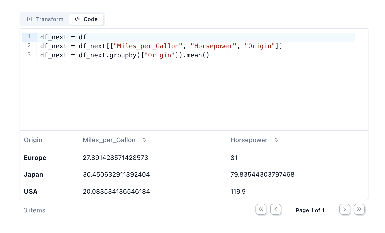 Use mo.ui.dataframe to interactively transform a dataframe with a GUI, no coding required. When you're done, you can copy the code that the GUI generated for you and paste it into your notebook.